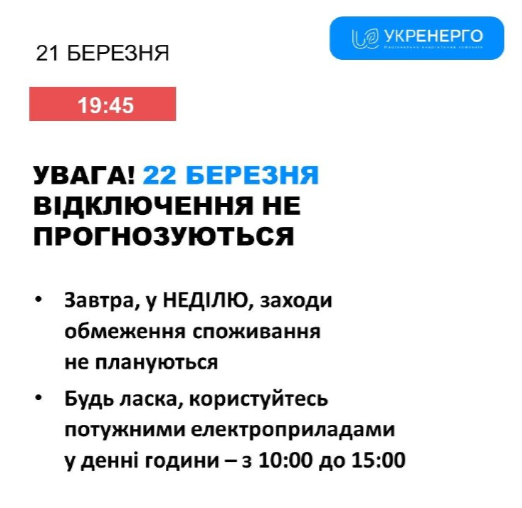 "Увага, 22 березня відключення не прогнозуються. Завтра, у неділю, заходи обмеження споживання не плануються", — йдеться у повідомленні.