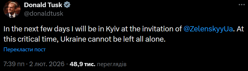 У понеділок, 2 лютого, прем’єр-міністр Польщі Дональд Туск заявив, що прибуде до Києва. Візит відбудеться "найближчими днями".