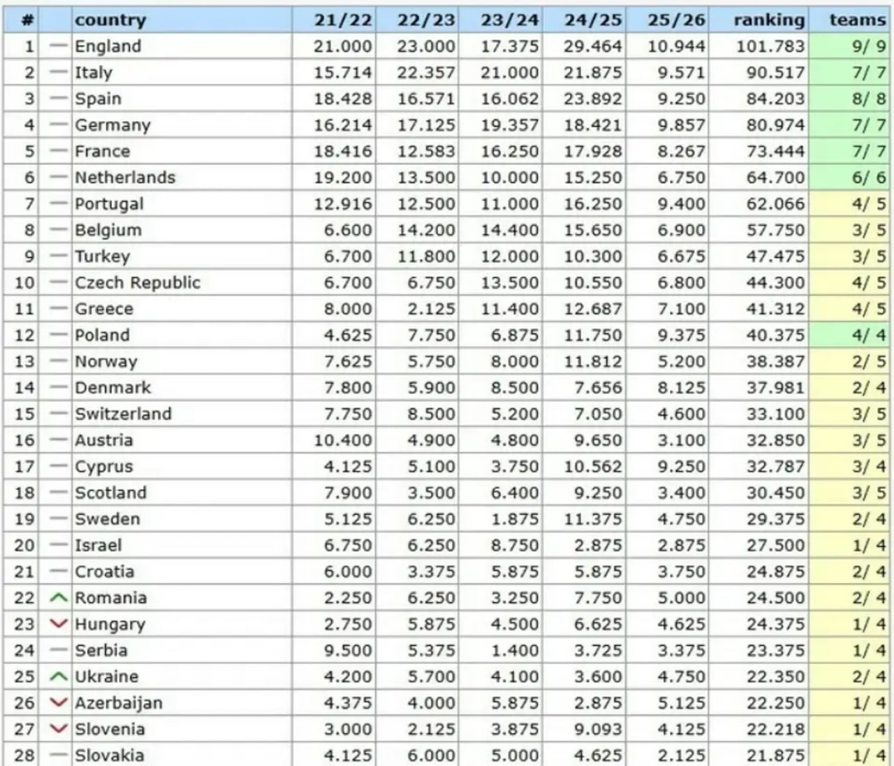 У п'ятницю, 28 листопада, оновилася таблиця коефіцієнтів УЄФА. Україна обійшла Словенію та Азербайджан і піднялася на 25-те місце.