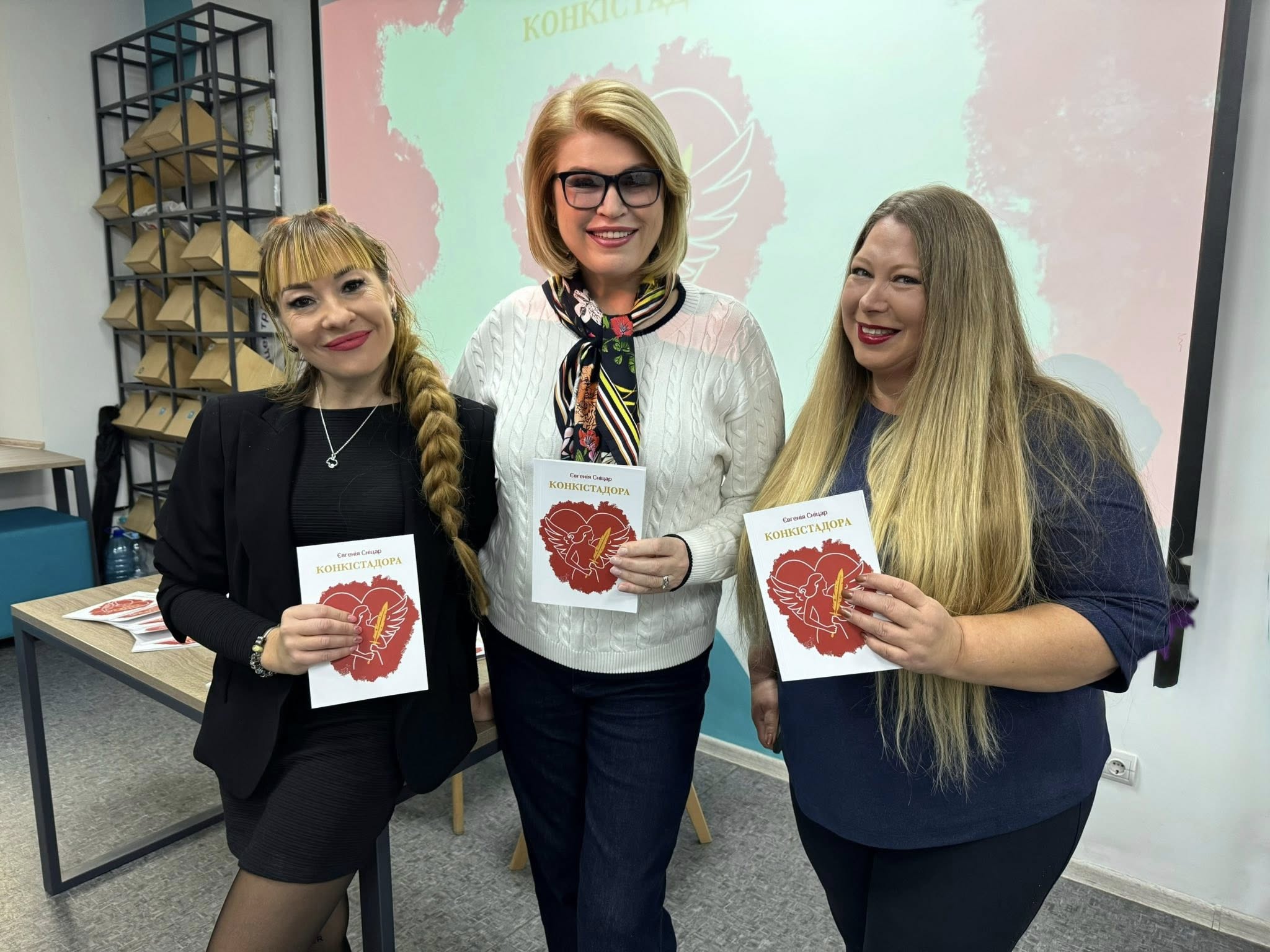 "Ми познайомилися з Євгенією в Барселоні, де нас об’єднав XI Міжнародний фестиваль української культури Ucrania Fest, який організовує президент Української Асоціації "Джерело", перша українка в Іспанії, яка є Дамою Мальтійського Ордену, Ольга Дзюбан за підтримки Генерального консульства України в Барселоні, регіональної влади Каталонії та міської влади Барселони. Презентація книги "Конкістадора" — перший наш спільний проект – обкладинку для книги створила постійна учасниця міжнародних проектів Adrum, художник-ілюстратор Тетяна Гущина. Це перший крок у наміченій співпраці поетеси та українських художників, учасників арт марафону "Покоління війни"", — розповіла президент Асоціації з розвитку міжнародних відносин ADRUM Тетяна Колесніченко.