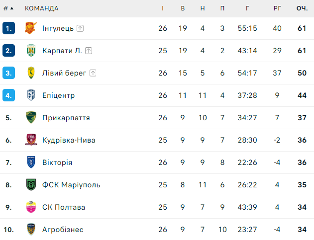 Раніше в УПЛ повернулися львівські "Карпати". Третій "Лівий берег" з 49 очками за три тури до завершення сезону вже не зможе обійти "Інгулець" і "Карпати".