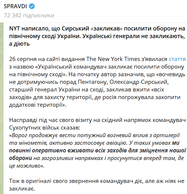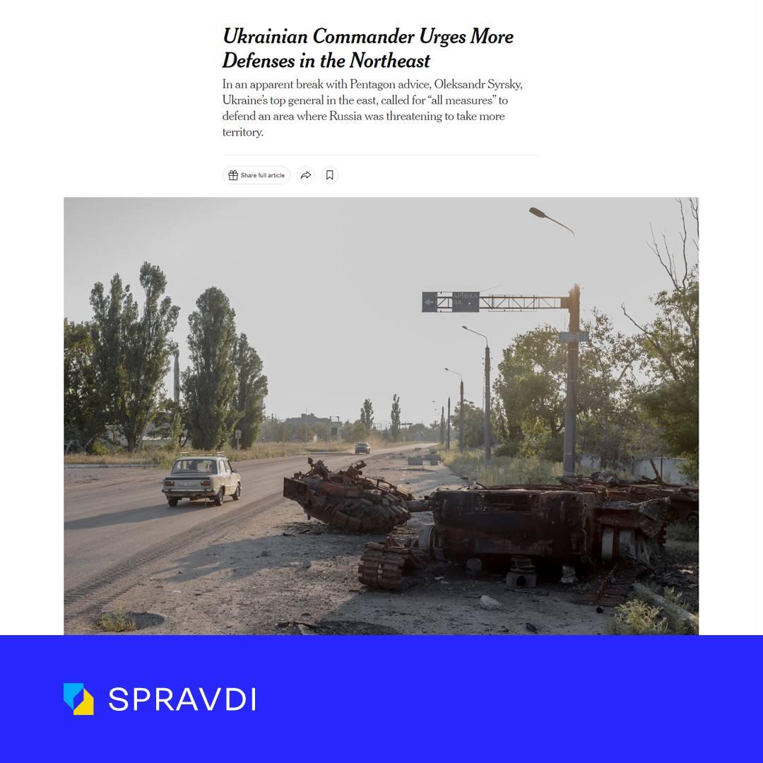 Зазначається, що 26 серпня на сайті видання The New York Times зʼявилася стаття з назвою "Український командувач закликає посилити оборону на північному сході". На початку автор зазначив, що "вочевидь не дотримуючись порад Пентагону, Олександр Сирський, старший генерал України на Сході, закликав вжити "всіх заходів" для захисту території, де Росія погрожувала захопити додаткові території". Своєю чергою українські аналітики пояснили, що "українські генерали не закликають, а діють".