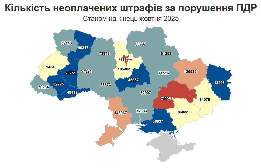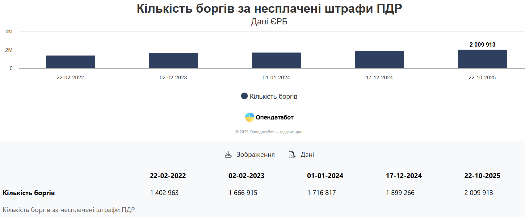 Так, на кінець жовтня 2025 року у Єдиному реєстрі боржників за порушення ПДР нараховується понад два мільйони штрафів. За час повномасштабної війни кількість неоплачених штрафів зросла на 43%.