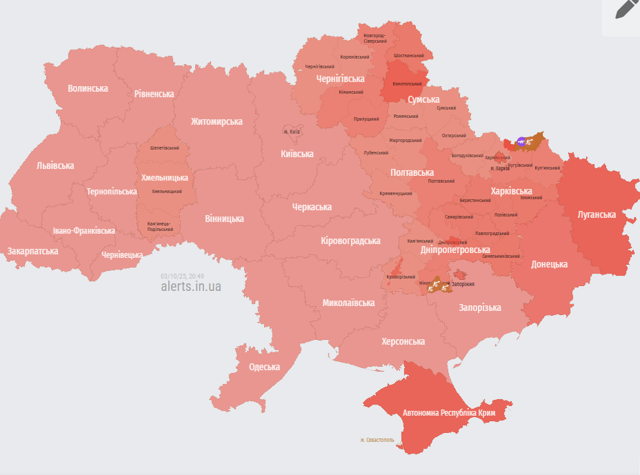 Інформації про пуски ракет не було. Мапа тривог о 20:50 мала такий вигляд: