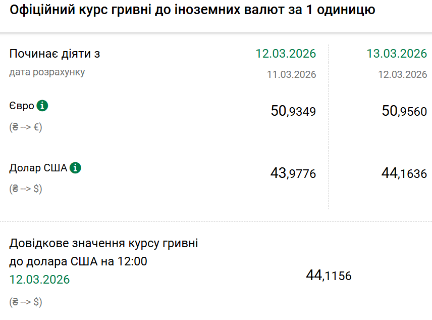 Так, на п'ятницю, 13 березня, Нацбанк встановив офіційний курс на рівні 44,16 гривні за один долар. Офіційний курс у четвер був 43,97. На готівковому ринку долар зріс на 10 копійок — 43,40 гривні.