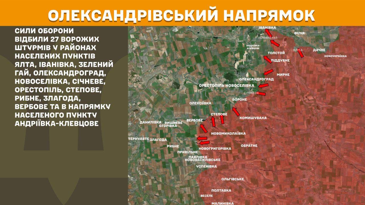 На Олександрівському напрямку Сили оборони відбили 27 ворожих штурмів у районах населених пунктів Ялта, Іванівка, Зелений Гай, Олександроград, Новоселівка, Січневе, Орестопіль, Степове, Рибне, Злагода, Вербове та в напрямку населеного пункту Андріївка-Клевцове.