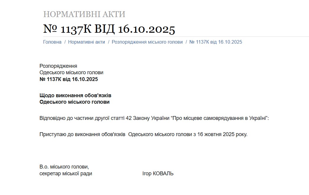 У четвер, 16 жовтня, обовʼязки міського голови Одеси виконує секретар Одеської міської ради Ігор Коваль.