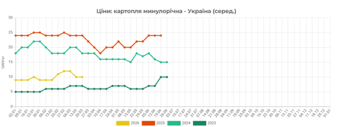 Крім того, сьогодні картопля в Україні надходить у продаж у середньому на 62% дешевше, ніж наприкінці березня 2025 року.