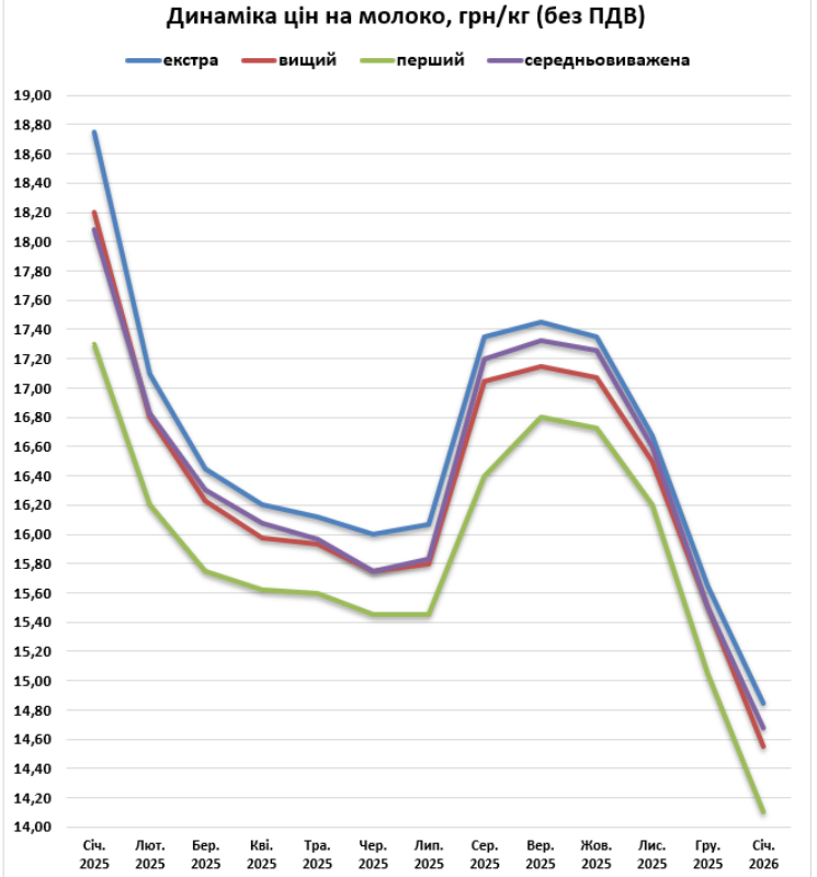 Середня закупівельна ціна молока екстра ґатунку станом на 20 січня становила 14,50 гривні без ПДВ, що на 80 копійок менше відносно попереднього місяця. Вищий ґатунок в середньому коштує 14,30 гривні, що на 90 копійок менше відносно грудня. Середня ціна на молоко першого ґатунку становила 13,90 гривні і знизилася на 90 копійок відносно попереднього місяця.