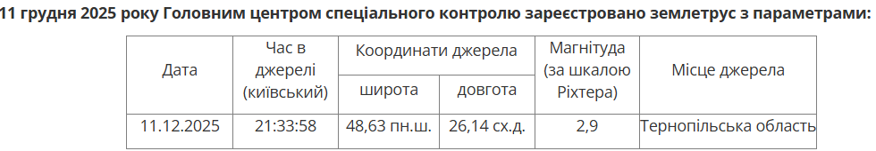 У четвер, 11 грудня 2025 року, на території Тернопільської області було зареєстровано землетрус. Його магнітуда становила 2,9 за шкалою Ріхтера.