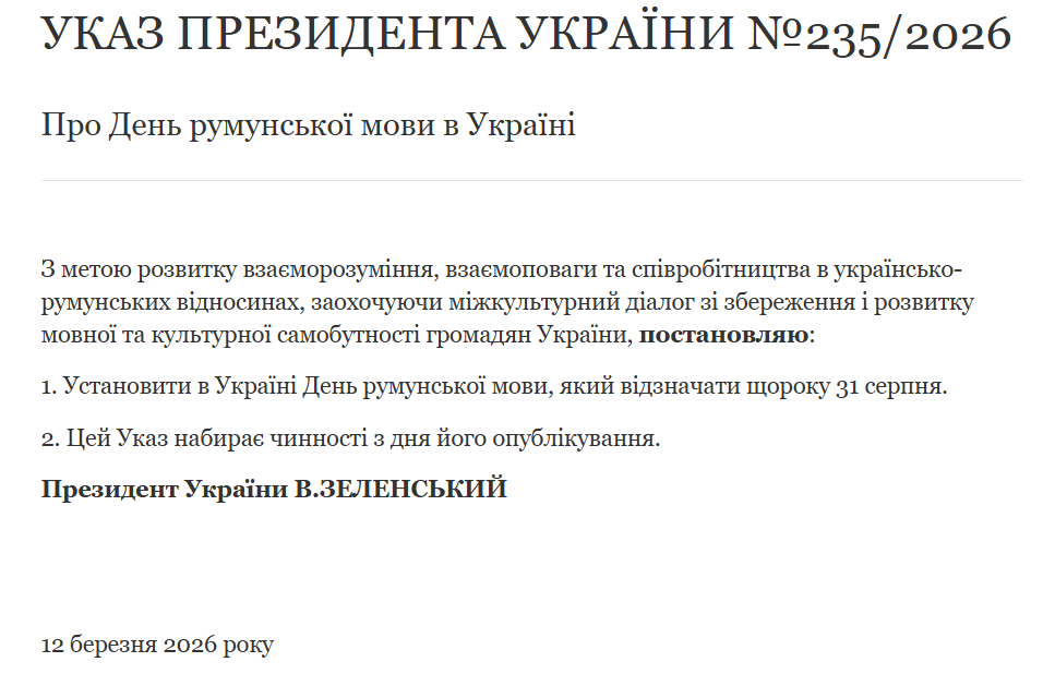"З метою розвитку взаєморозуміння, взаємоповаги та співробітництва в українсько-румунських відносинах, заохочуючи міжкультурний діалог зі збереження і розвитку мовної та культурної самобутності громадян України, постановляю: установити в Україні День румунської мови, який відзначати щороку 31 серпня", — йдеться у документі.