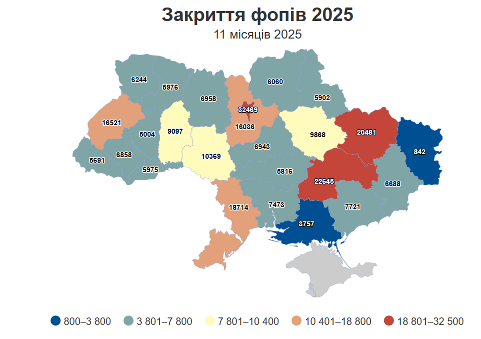 Згідно з актуальними даними Єдиного державного реєстру, від початку 2025 року в Україні офіційно закрилося 250 209 приватних підприємців. Статистика свідчить, що середньостатистичний український підприємець залишається "на плаву" протягом двох років та чотирьох місяців.