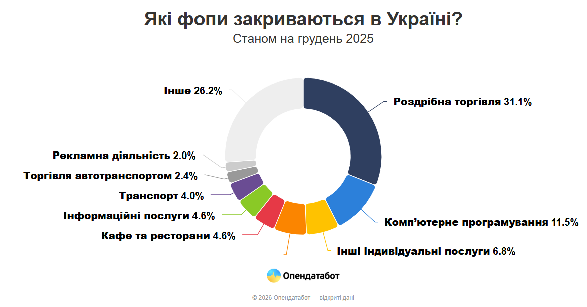 Найбільш вразливою галуззю виявилася торгівля, на яку припадає майже половина всіх випадків. Зокрема, у роздрібній торгівлі закрилося понад 77 тисяч об'єктів, які в середньому існують менш як три роки, а в гуртовій — близько 17 тисяч підприємців із середнім терміном життя лише трохи більше одного року. Другу сходинку за кількістю припинень посіла сфера IT, де діяльність завершили понад 28 тисяч фахівців, хоча саме айтівці належать до категорії довгожителів із середнім стажем роботи майже чотири роки.