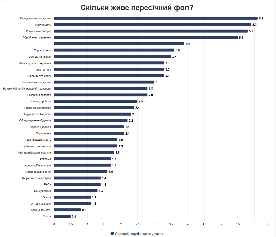 Аналіз тривалості роботи в різних нішах демонструє значний розрив між лідерами та аутсайдерами ринку. Найбільш сталими є підприємці, що займаються складським господарством, чий термін роботи перевищує шість років, а також представники сфери нерухомості та ремонту техніки, які стабільно працюють понад п'ять років.