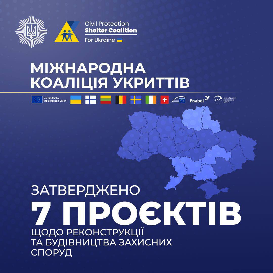 Міжнародна коаліція укриттів цивільного захисту затвердила сім проєктів зі зведення та модернізації укриттів. Нові захисні споруди з’являться в Чернігівській, Дніпропетровській, Херсонській, Миколаївській, Одеській і Сумській областях.