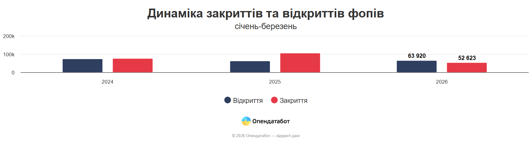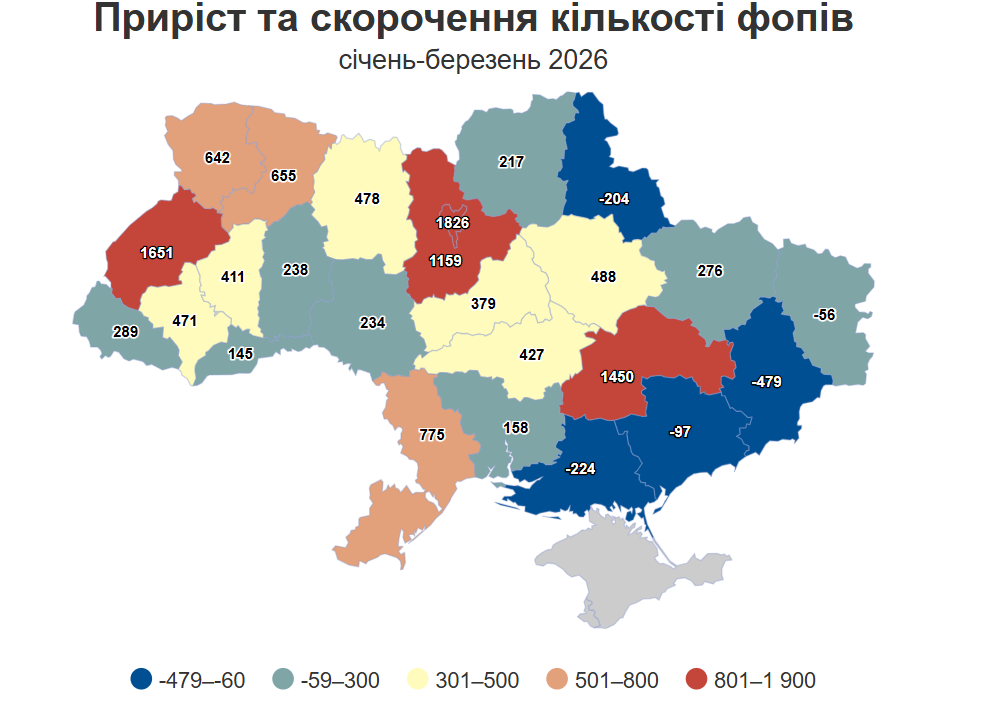 Так, за даними аналітиків, найбільша різниця між відкриттям та закриттям власної справи зафіксована у Києві, на Львівщині та Дніпропетровщині. На 11 297 нових ФОПів більше відкрилось, ніж закрилось за перший квартал 2026 року. Загалом 63 920 підприємців відкрили свою справу, а 52 623 ФОПи припинили свою діяльність. Це дані з січня по березень 2026 року.