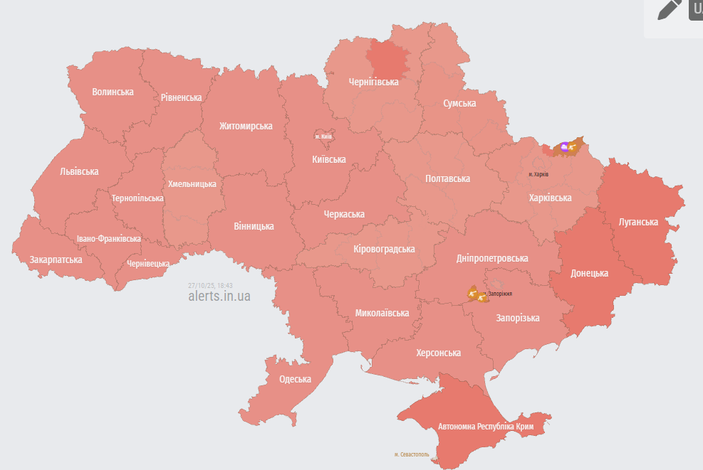 У понеділок, 27 жовтня, в Україні оголошували масштабну повітряну тривогу. Сирени лунали по всіх областях.