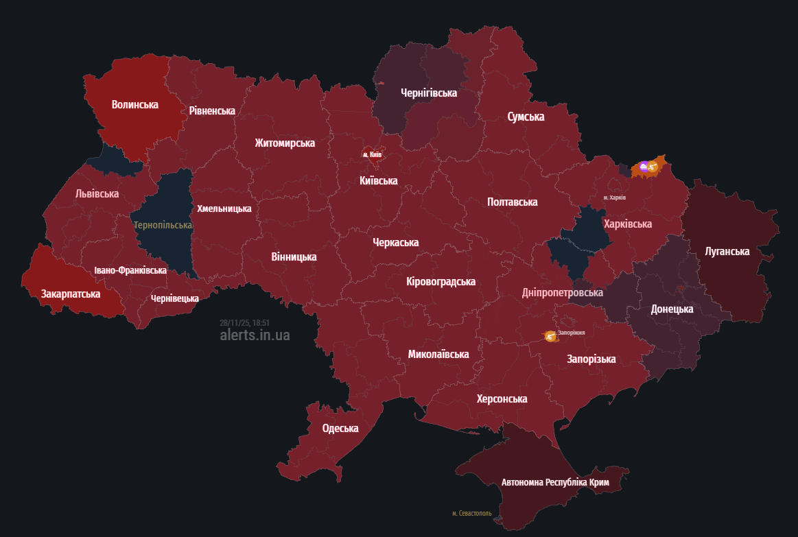Ввечері 28 листопада в Україні оголосили масштабну повітряну тривогу. Причина — ракетна небезпека.