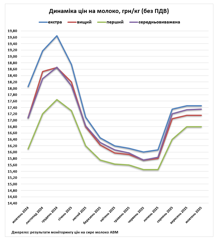 Середня закупівельна ціна молока екстра ґатунку станом на 6 жовтня склала 17,45 гривні за кілограм без ПДВ, що на 10 копійок більше відносно попереднього місяця. Вищий ґатунок в середньому коштує 17,15 гривні. За останній місяць ціна не змінилася. Ціни на молоко вищого ґатунку коливаються від 16,80 до 17,60 гривень. Середня ціна на молоко першого ґатунку склала 16,80 гривень і не змінилася відносно попереднього місяця.