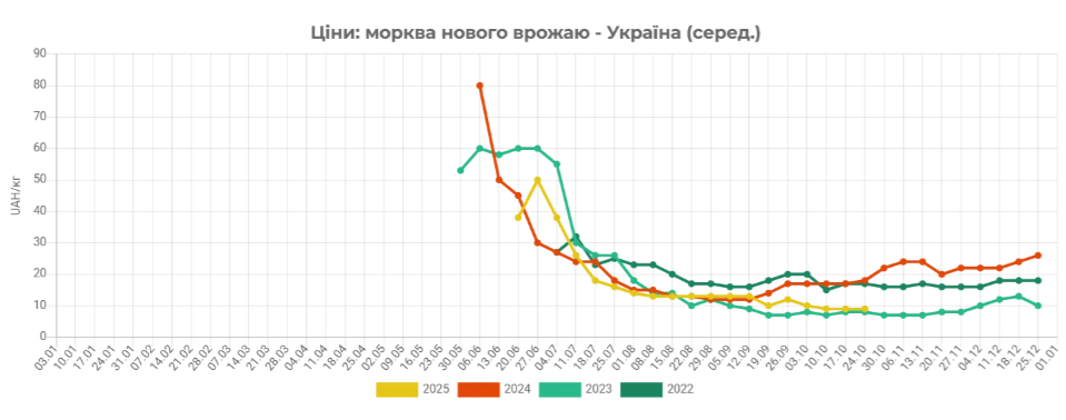 "Подальше подорожчання може мотивувати фермерів розпочати розпродаж моркви зі сховищ, що призведе до збільшення постачання та, як наслідок, до зниження цін", — припустили експерти.