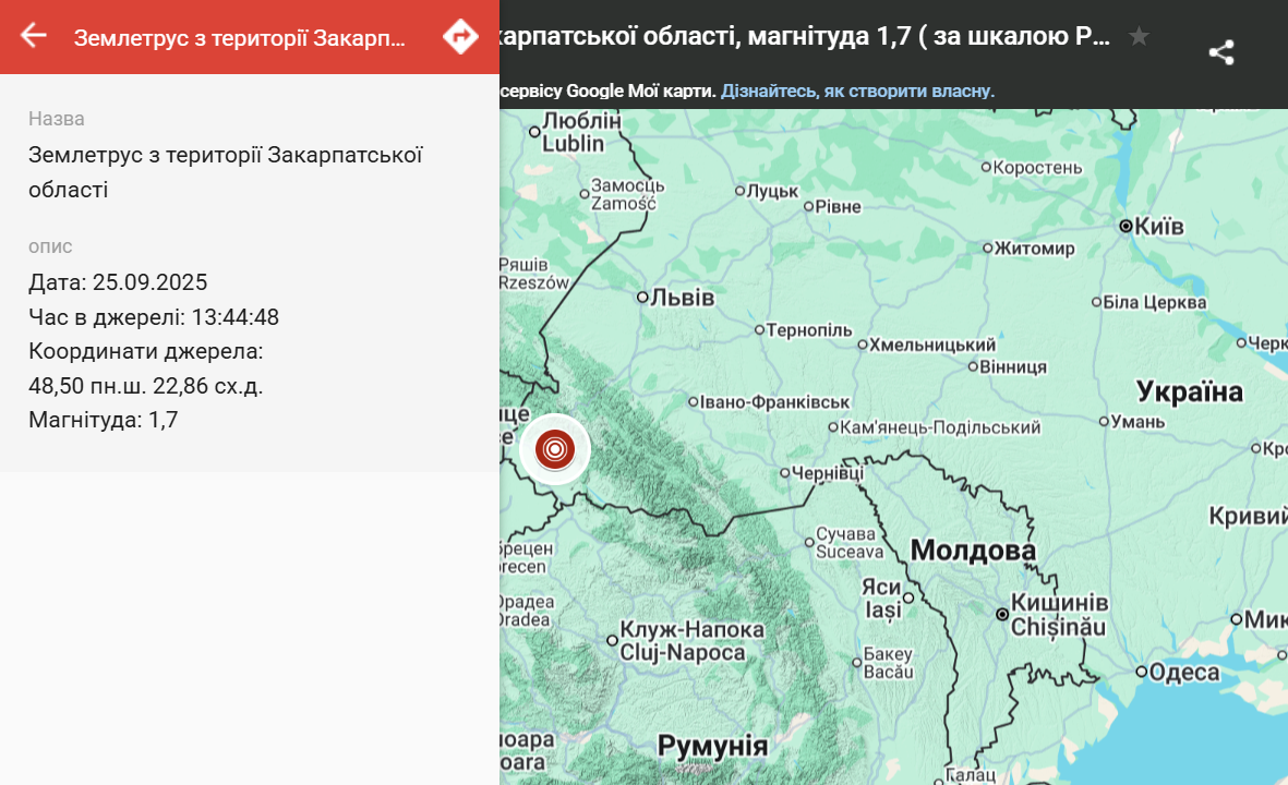У четвер, 25 вересня, спеціалісти зафіксували землетрус на території Закарпатської області. Магнітуда підземних поштовхів становила 1,7 бала.
