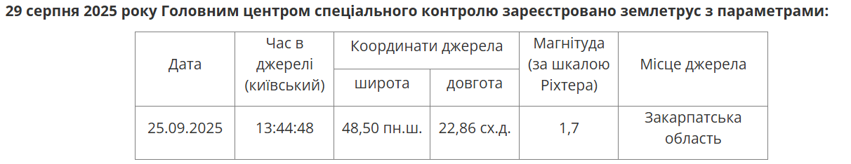 "25 вересня 2025 року Головним центром спеціального контролю зареєстровано землетрус з території Закарпатської області, магнітудою 1,7 (за шкалою Ріхтера), на глибині чотири кілометри", — йдеться у повідомленні.