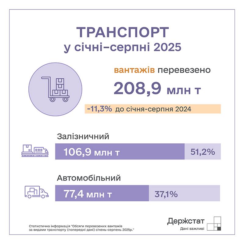"У січні — серпні 2025 року перевезено 208,9 мільйона тонн вантажів, що на 11,3 процента менше, ніж торік. Основні обсяги перевезено: 106,9 мільйона тонн — залізничним транспортом, 77,4 мільйона тонн — автомобільним", — зазначається у зведенні.