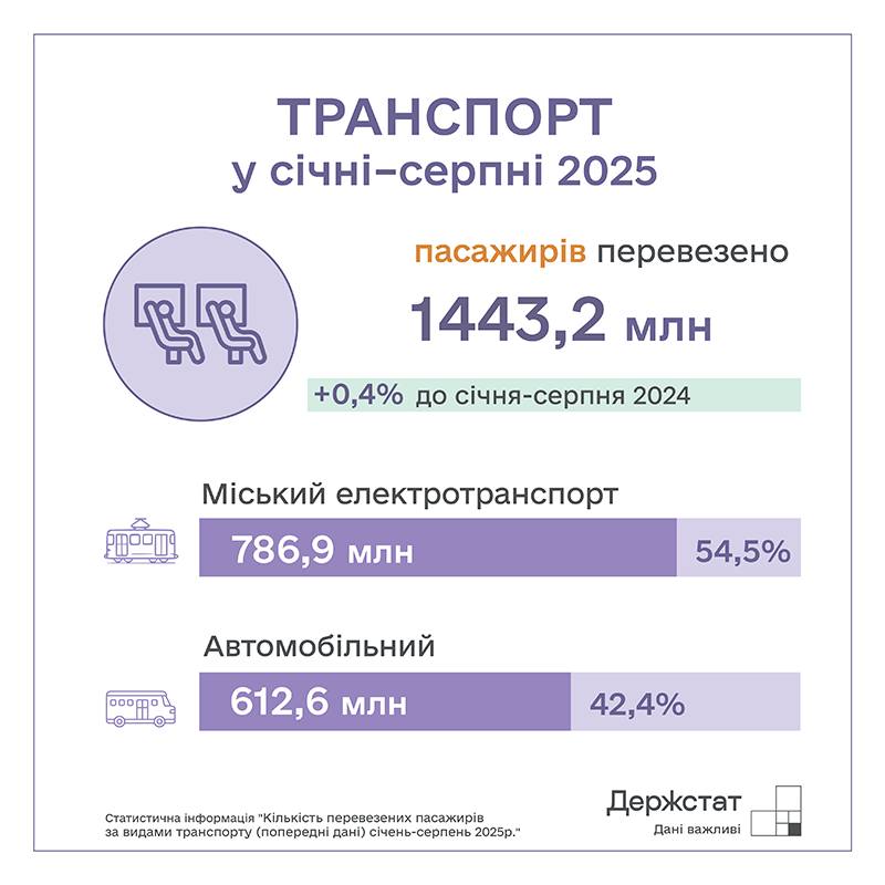 Водночас за вісім місяців 2025 року стрибок демонструють пасажирські перевезення. За цей період пасажирським транспортом загалом скористалися 1 443,2 мільйона осіб, що 0,4 процента більше за показник попереднього року.