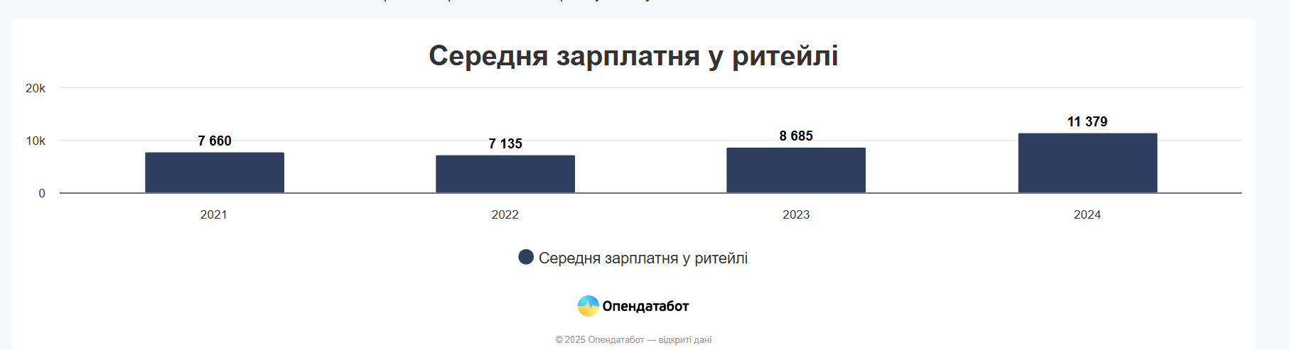 У перший рік повномасштабної війни, коли "бізнес виживав, а не планував", зарплати працівників у сфері торгівлі навіть просіли — до 7 135 гривень на місяць.
