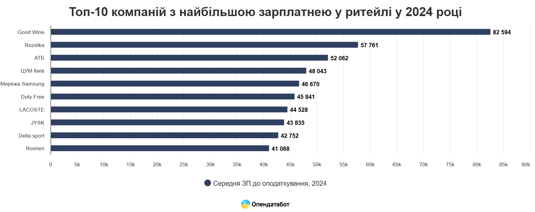 "Так, найбільшу середню заробітну платню (82 тисячі гривень) отримують у "Бюро вин" (мережа GoodWine), у "Розетці" та АТБ — від 52 до 57 тисяч гривень, а у "Форі" та "Новусі" — близько 26 тисяч на місяць", — зазначають аналітики.