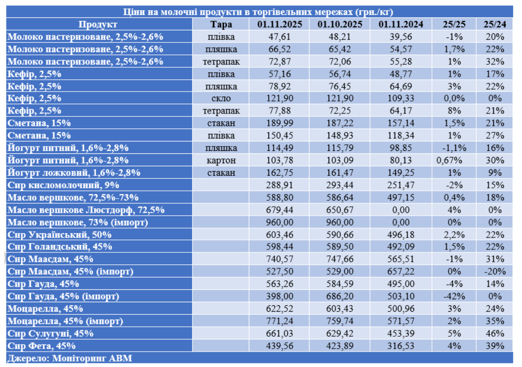 Молоко пастеризоване в плівці (жирністю до 2,6%) в середньому коштує 47,61 гривні за кілограм, що на 59 копійок менше порівняно з попереднім місяцем, але на 8,05 гривні більше відносно торішнього періоду. Молоко пастеризоване в пластиковій пляшці (жирність до 2,6%) продають по 66,52 гривні, що на 1,10 копійок більше порівняно з попереднім місяцем і на 11,96 гривні більше відносно минулого року.