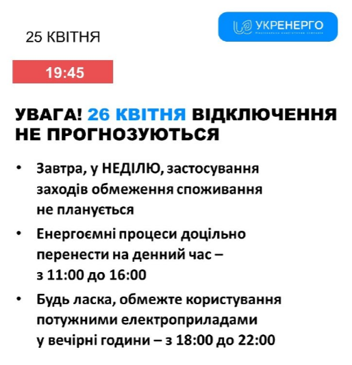 На неділю, 26 квітня, в Україні не планують застосовувати графіки відключення електроенергії. Енергетики закликали перенести використання потужних приладів на денні години.