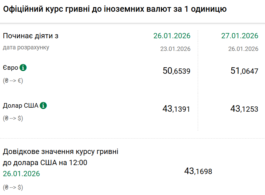 Станом на 27 січня Нацбанк встановив офіційний курс долара на рівні 43,12 гривні. Офіційний курс у понеділок був 43,13. На готівковому ринку долар впав на 10 копійок — 42,80 гривні.