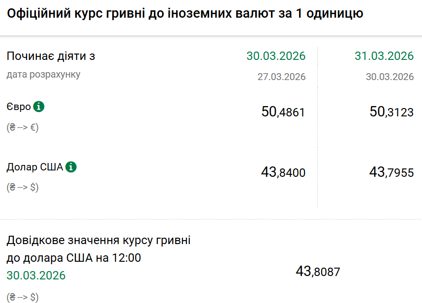 Так, на вівторок, 31 березня, Нацбанк встановив офіційний курс на рівні 43,79 гривні за один долар. Офіційний курс у понеділок був 43,84. На готівковому ринку долар не змінився — 43,10 гривні.