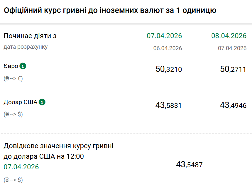 Так, на середу, 8 квітня, Нацбанк встановив офіційний курс на рівні 43,49 гривні за один долар. Офіційний курс у вівторок був 43,58. На готівковому ринку долар не змінився — 43,15 гривні.