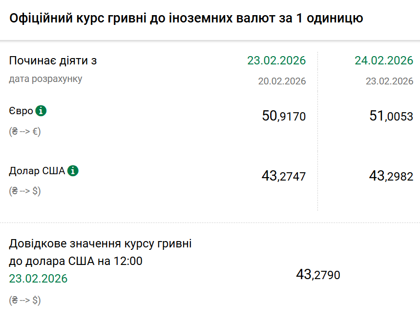 Так, на вівторок, 24 лютого, Нацбанк встановив офіційний курс на рівні 43,29 гривні за один долар. Офіційний курс у понеділок був 43,27. На готівковому ринку долар зріс на п'ять копійок — 43,10 гривні.