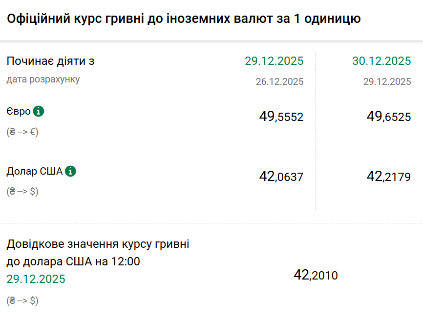 Так, на вівторок, 30 грудня, Нацбанк встановив офіційний курс на рівні 42,21 гривні за один долар. Офіційний курс у понеділок був 42,06. На готівковому ринку долар зріс на 15 копійок — 42,40 гривні.