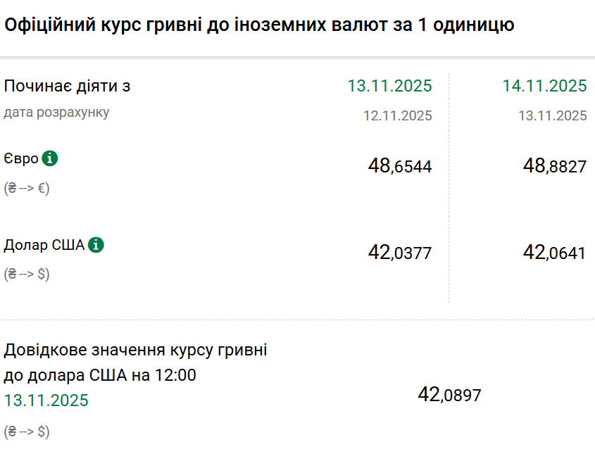 Так, на п'ятницю, 14 листопада, Нацбанк встановив офіційний курс на рівні 42,06 гривні за один долар. Офіційний курс у четвер становив 42,03 гривні за один долар. На готівковому ринку долар зріс на 10 копійок — 42,25 гривні.