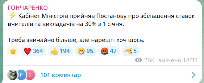 "Кабінет міністрів прийняв постанову про збільшення ставок вчителів та викладачів на 30% з 1 січня", — написав він на своїй сторінці в Telegram.