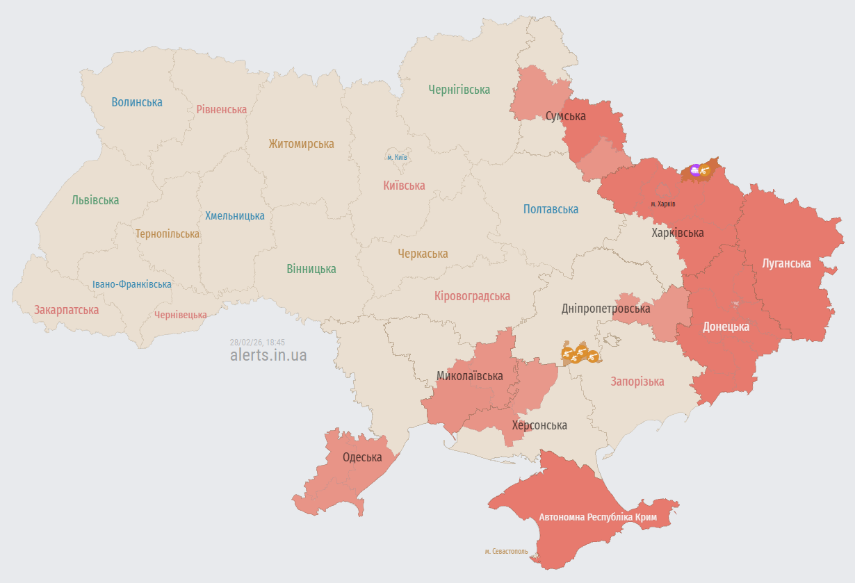 Увечері 28 лютого російські окупаційні війська запустили кілька груп ударних безпілотників по території України. Під загрозою атаки опинилися Харківська, Миколаївська та Сумська області, де зафіксовано рух ворожих об'єктів у бік великих населених пунктів.