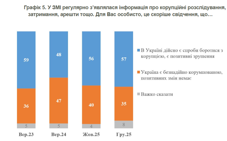 Оцінка боротьби з корупцією залишається стабільною. Більшість населення (57%) бачить позитивні зрушення та реальні спроби викорінити зловживання. Водночас кількість тих, хто вважає Україну "безнадійно корумпованою", зменшилася з 40% до 35%.