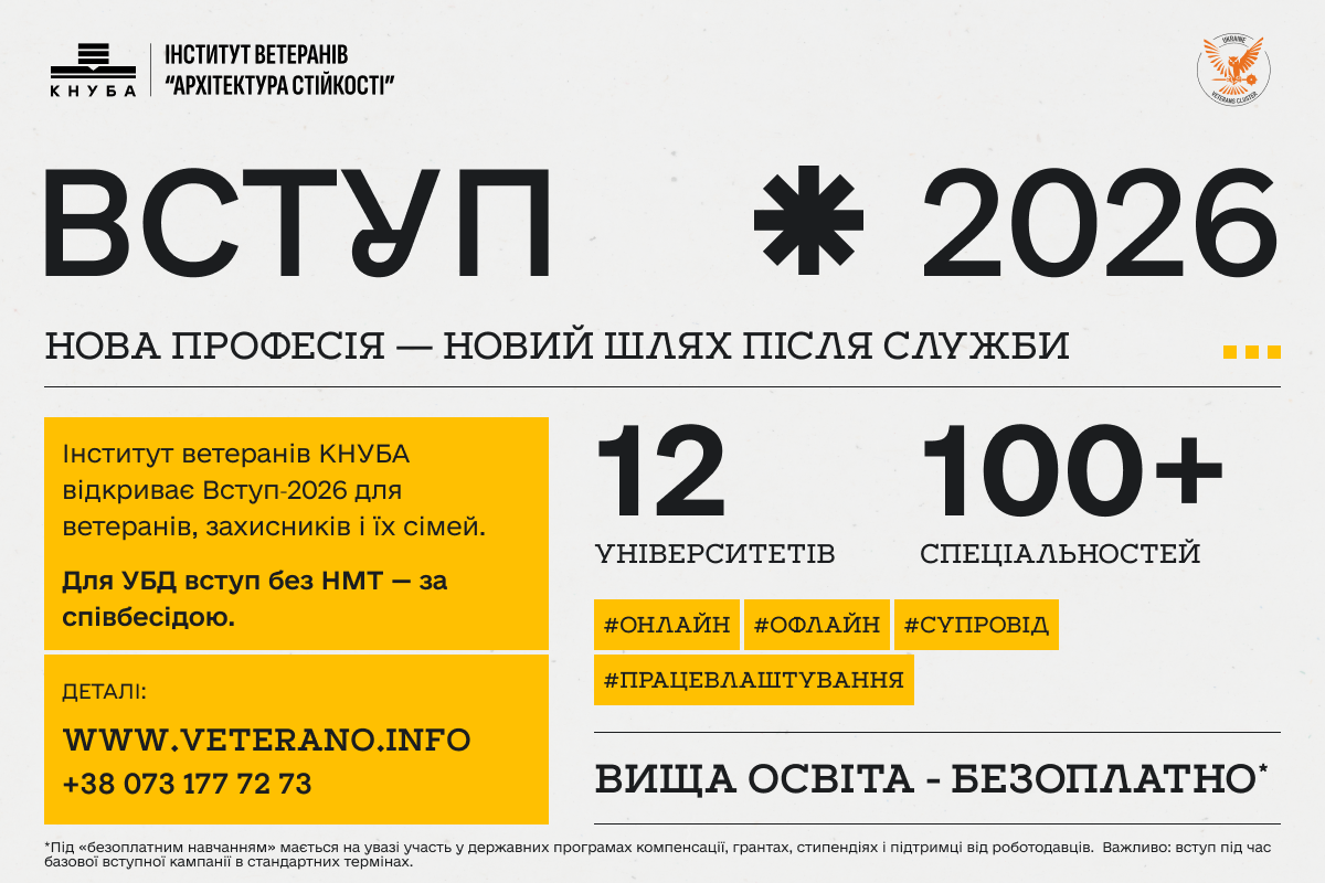 Також звертаємо вашу увагу, що розпочинається вступна кампанія "Вступ‑2026: Нова професія — новий шлях після служби". Інститут ветеранів КНУБА відкриває вступ‑2026 для ветеранів, захисників і їх сімей. Для УБД вступ без НМТ — за співбесідою.