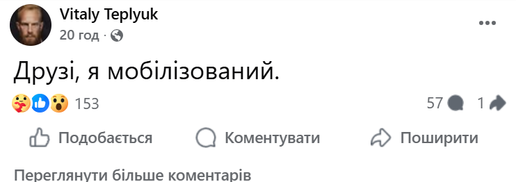 Також Теплюк звернувся до своїх підписників із проханням підтримати його матір. Водночас інших подробиць про мобілізацію він не розкрив.