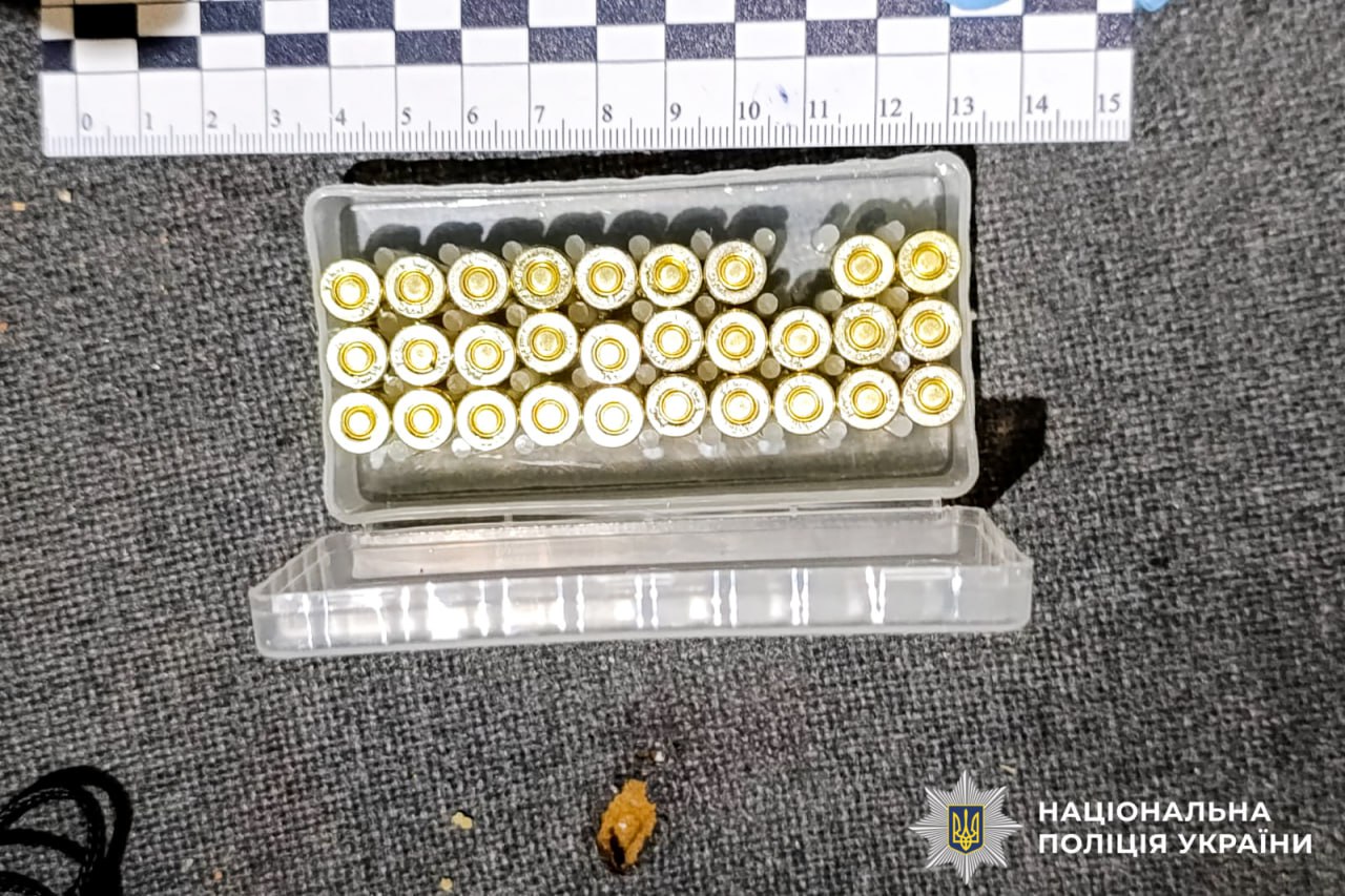 Під час обшуку поліцейські вилучили пістолет, автоматичну зброю, три пневматичні гвинтівки, штик-ніж, 29 холостих патронів, сім гільз, трубку для куріння та фольгу із нашаруванням психотропної речовини.