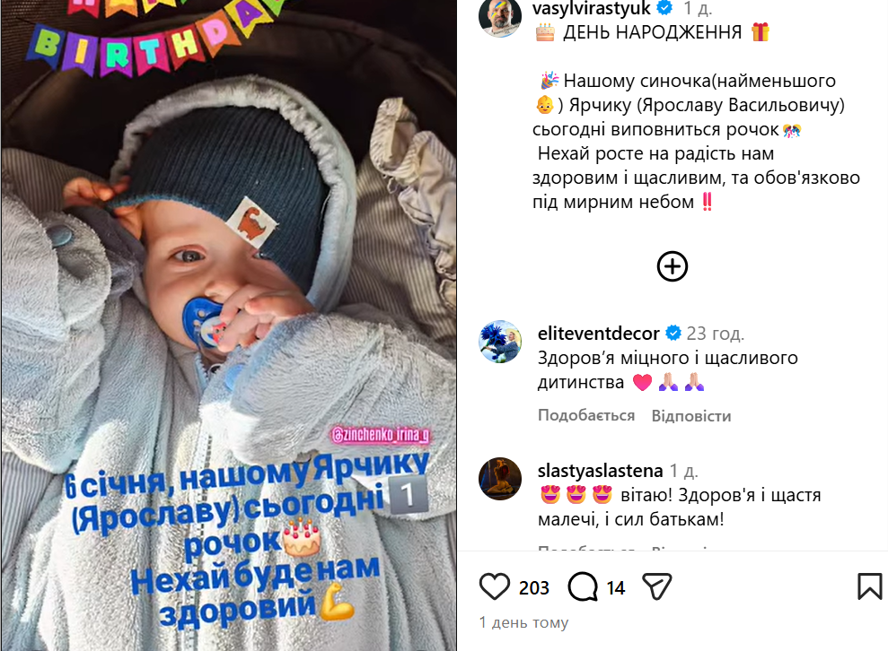 "Нашому найменшому синочку Ярчику (Ярославу Васильовичу) виповниться рочок. Нехай росте на радість нам здоровим і щасливим, та обов'язково під мирним небом", — підписав він світлину.