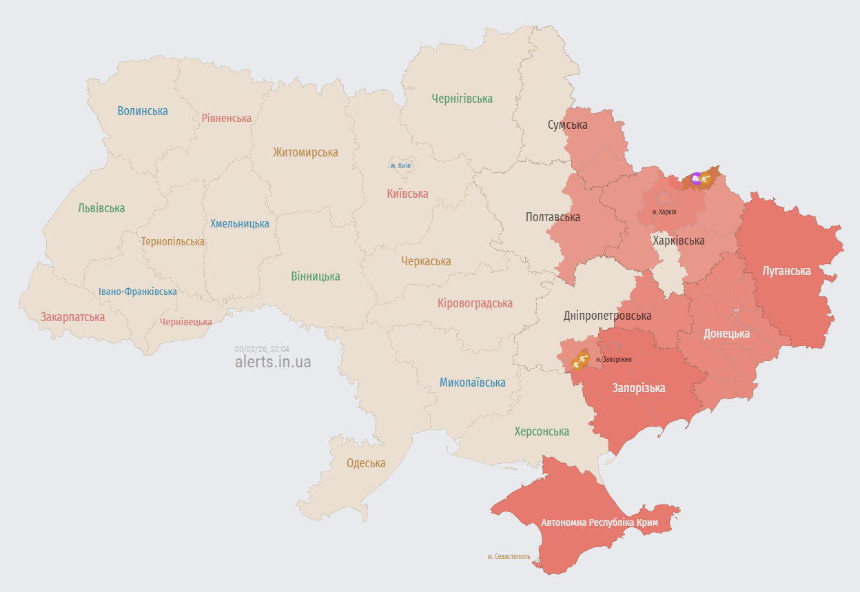 Станом на вечір вівторка, 3 лютого, російські окупаційні війська продовжують масовану атаку на північні та східні регіони України, застосовуючи керовані авіаційні бомби (КАБи) та ударні безпілотники. Під ударом опинилися Сумщина, Харківщина та Запоріжжя, а групи дронів змінюють курс, поширюючи загрозу на Полтавську та Чернігівську області.