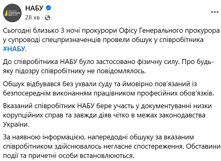 "Обшук відбувався без ухвали суду та ймовірно пов’язаний із безпосереднім виконанням працівником професійних обов’язків. Вказаний співробітник НАБУ бере участь у документуванні низки корупційних справ та завжди діяв чітко в межах законодавства України", — запевнили в НАБУ.