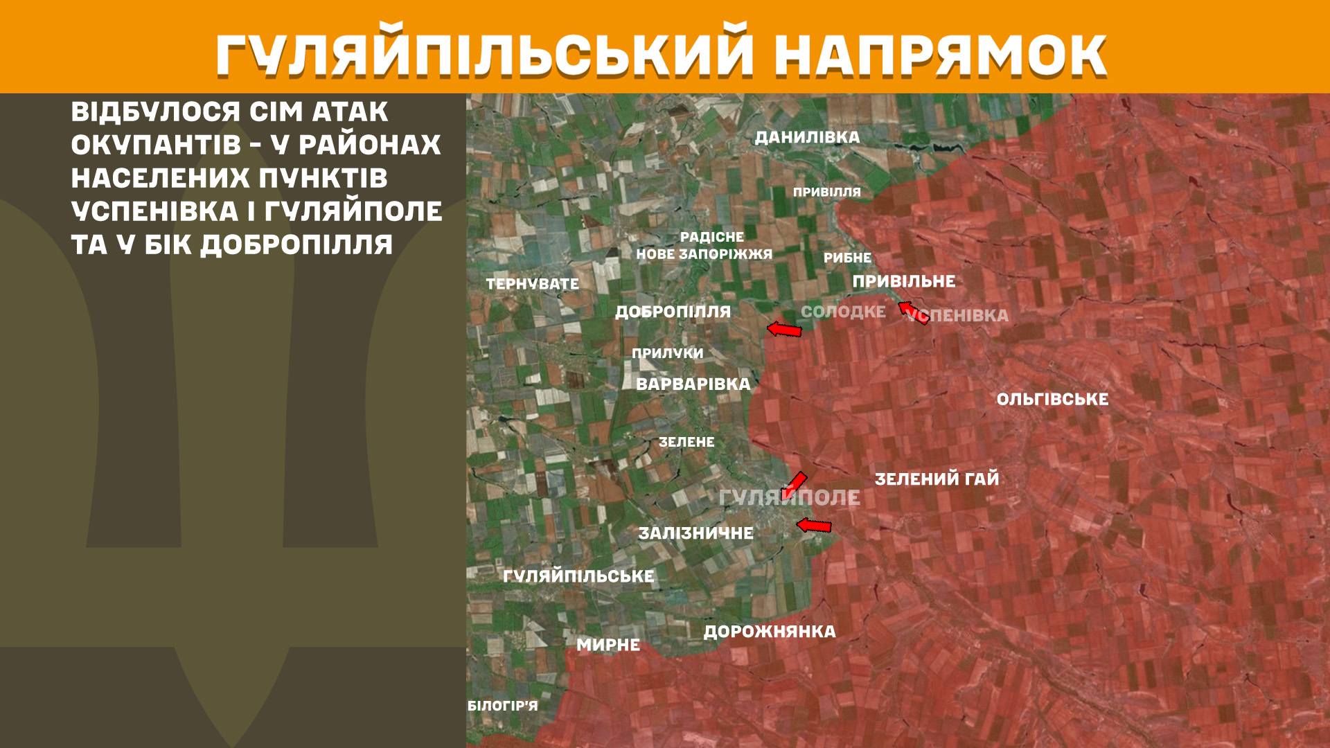 На Гуляйпільському напрямку відбулося сім атак окупантів — у районах населених пунктів Успенівка і Гуляйполе та у бік Добропілля.