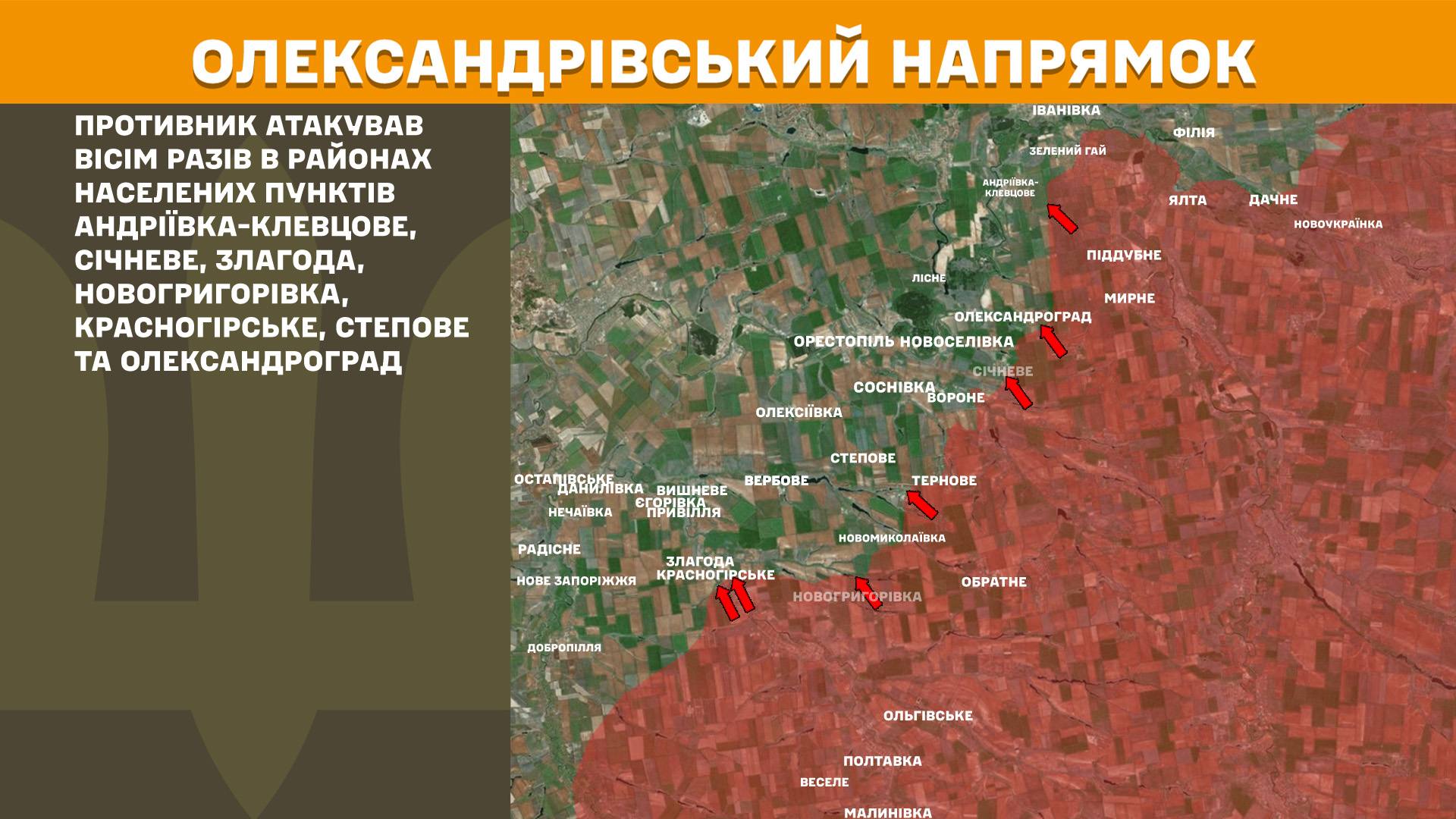 На Олександрівському напрямку противник атакував вісім разів в районах населених пунктів Андріївка-Клевцове, Січневе, Злагода, Новогригорівка, Красногірське, Степове та Олександроград.