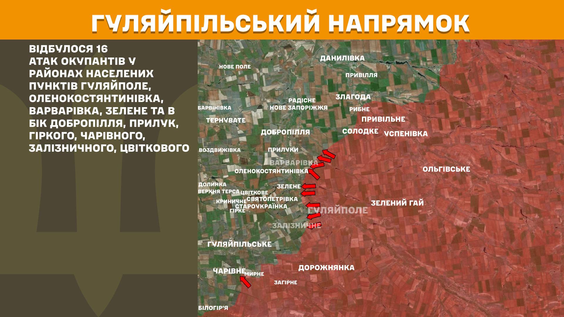 На Гуляйпільському напрямку відбулося 16 атак окупантів у районах населених пунктів Гуляйполе, Оленокостянтинівка, Варварівка, Зелене та в бік Добропілля, Прилук, Гіркого, Чарівного, Залізничного, Цвіткового.